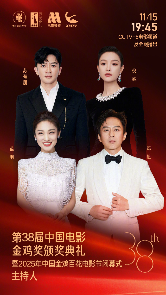 1905电影网讯 第38届中国电影金鸡奖颁奖典礼暨2025年中国金鸡百花电影节闭幕式主持阵容官宣!电影频道主持人蓝羽、电影人邓超、电影人苏有朋、电影人倪妮联袂主持,以“电影主持人+电影人”的组合,专业见证中国电影年度荣耀时刻。